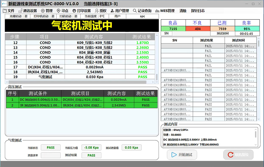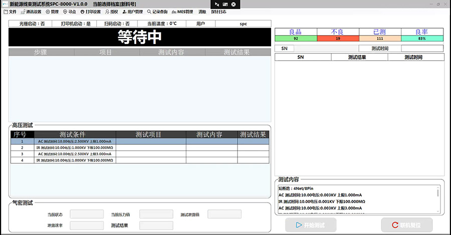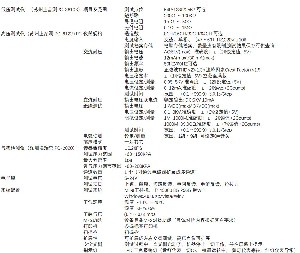 产品特点:适用于新能源高压线束的测试,主要可以测试线束通断、错位、微电阻、NTC电阻、绝缘、耐压、气密,针对充电座线束可以测试电子锁的功能。